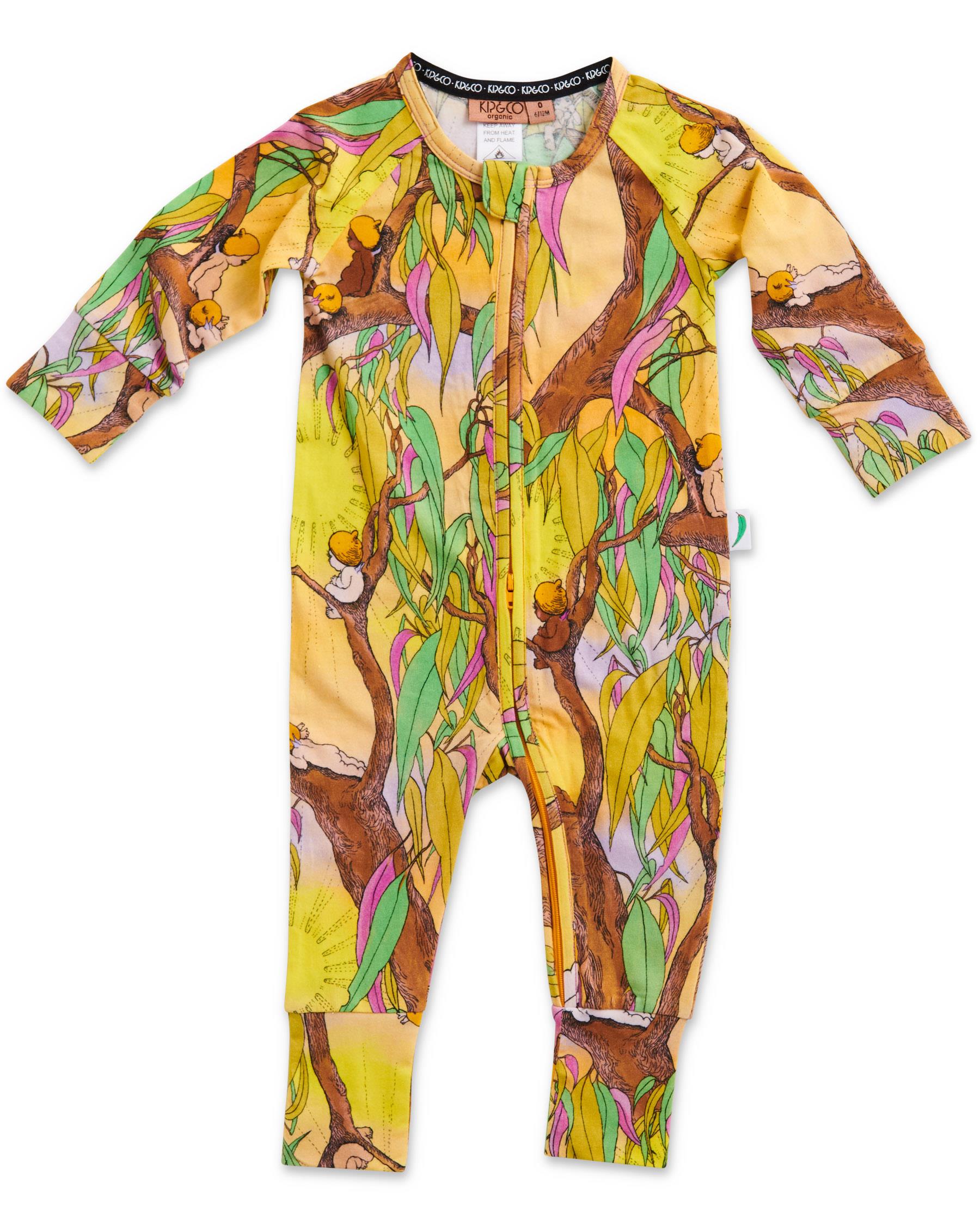 The Kip&Co x May Gibbs Sunrise Delight Organic Long Sleeve Zip Romper features gorgeous gumnut babies nestled in gum trees watching the sunrise. Relive the simple joys of childhood with your little snugglepot with our newest May Gibbs collaboration, celebrating a sweet revival of the illustrated characters and Aussie bush themes we grew to know and love.