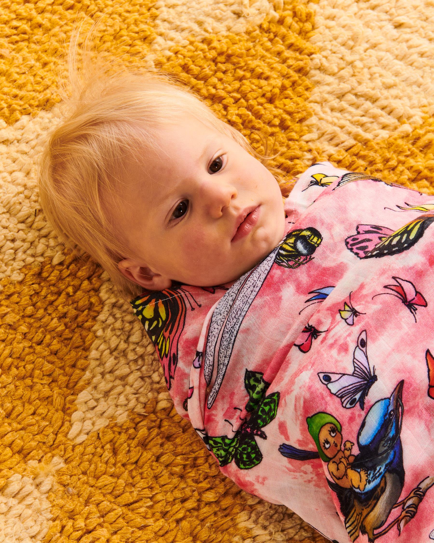 The Kip&Co x May Gibbs Fly Baby Bamboo Swaddle features flying gumnut babies on sparrows and gum blossom babies on dragonflies surrounded by butterflies on a tie dye print pink base. Our baby swaddles are made from 100% bamboo making them super soft. Snuggly and easy use to secure bubs for comfort and naps, swaddles are also handy as a light extra layer on the go and even a long time comforter to love through the years. The perfect gift for new mummas and babies!