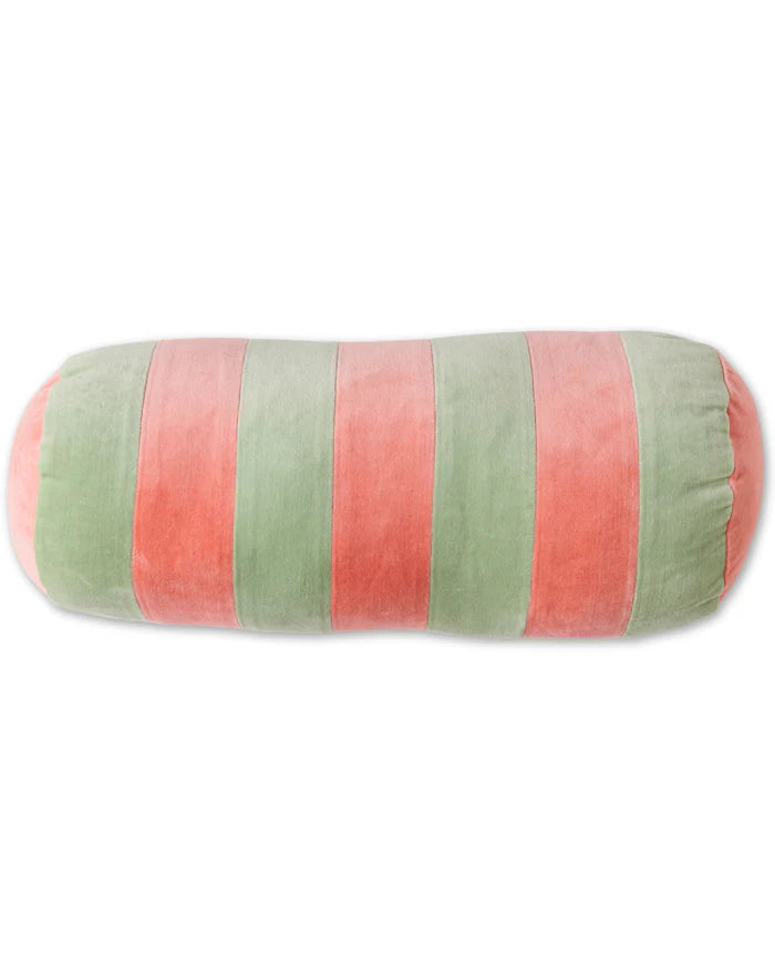 Kip and Co's velvet cushion range features shapes and styles to suit any taste, refreshed with new colours from season to season. The Tropics Velvet Bolster Cushion features striped velvet panels in peach and light green.