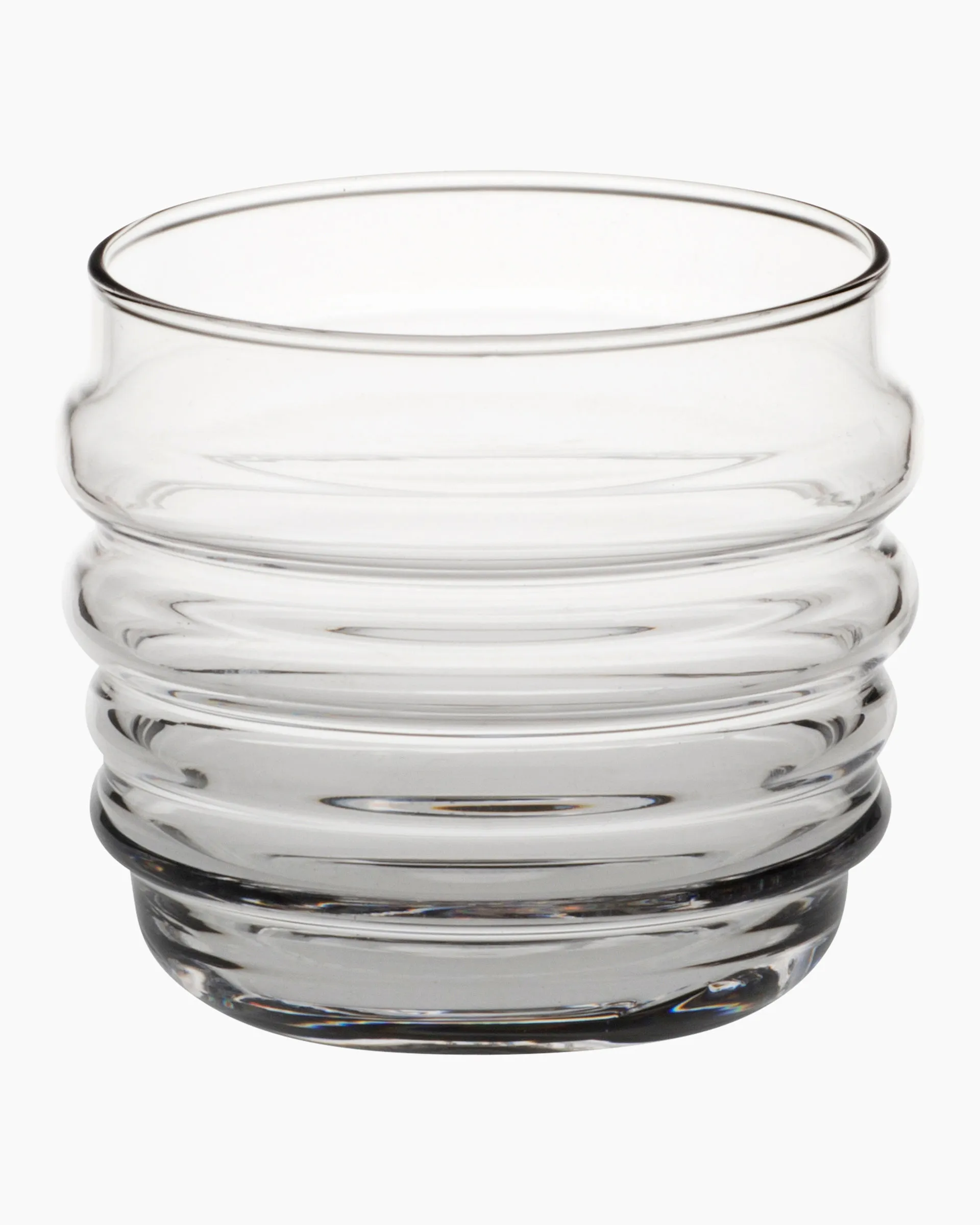 This set includes two clear Sukat Makkaralla tumblers, which are made of mouth blown glass. The Sukat Makkaralla (Socks Rolled Down) series is designed by Anu Penttinen to bring joy to the dinner table with its playful and unique shape that is like a sock leg, which has carelessly slumped down. The glasses are dishwasher safe.