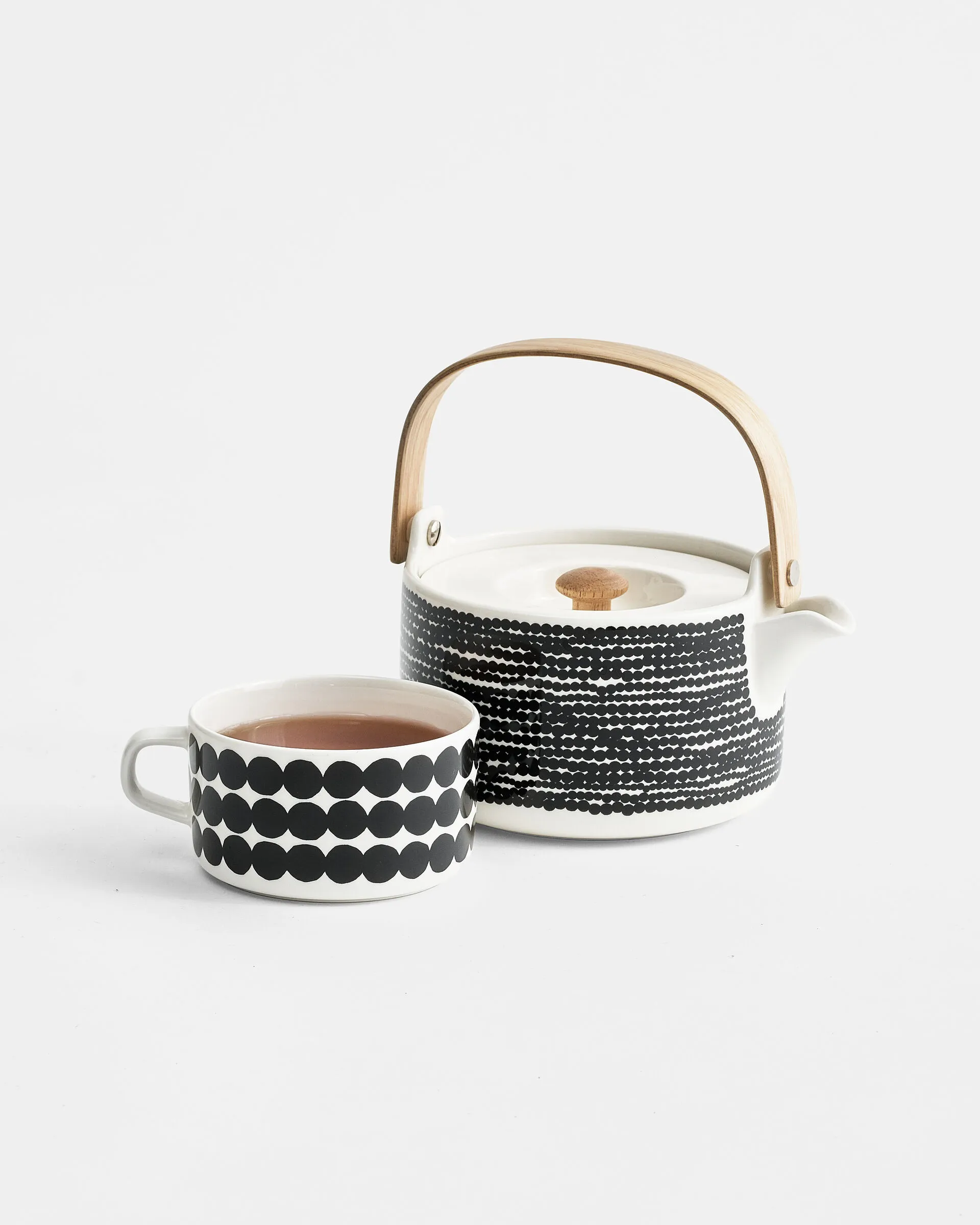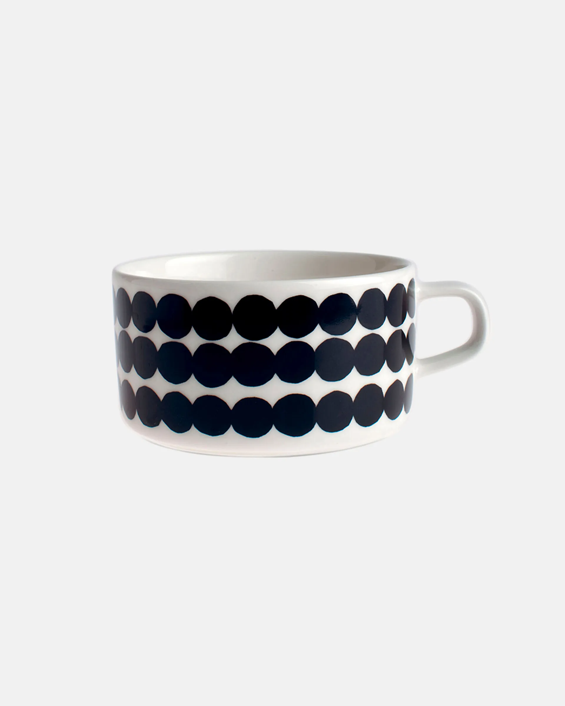 In the Räsymatto pattern on this Oiva teacup you can see a rag rug placed on the floor of a garden cottage, with rays of sun dancing on its figures. The cup is made of dishwasher, oven, microwave and freezer proof white stoneware.