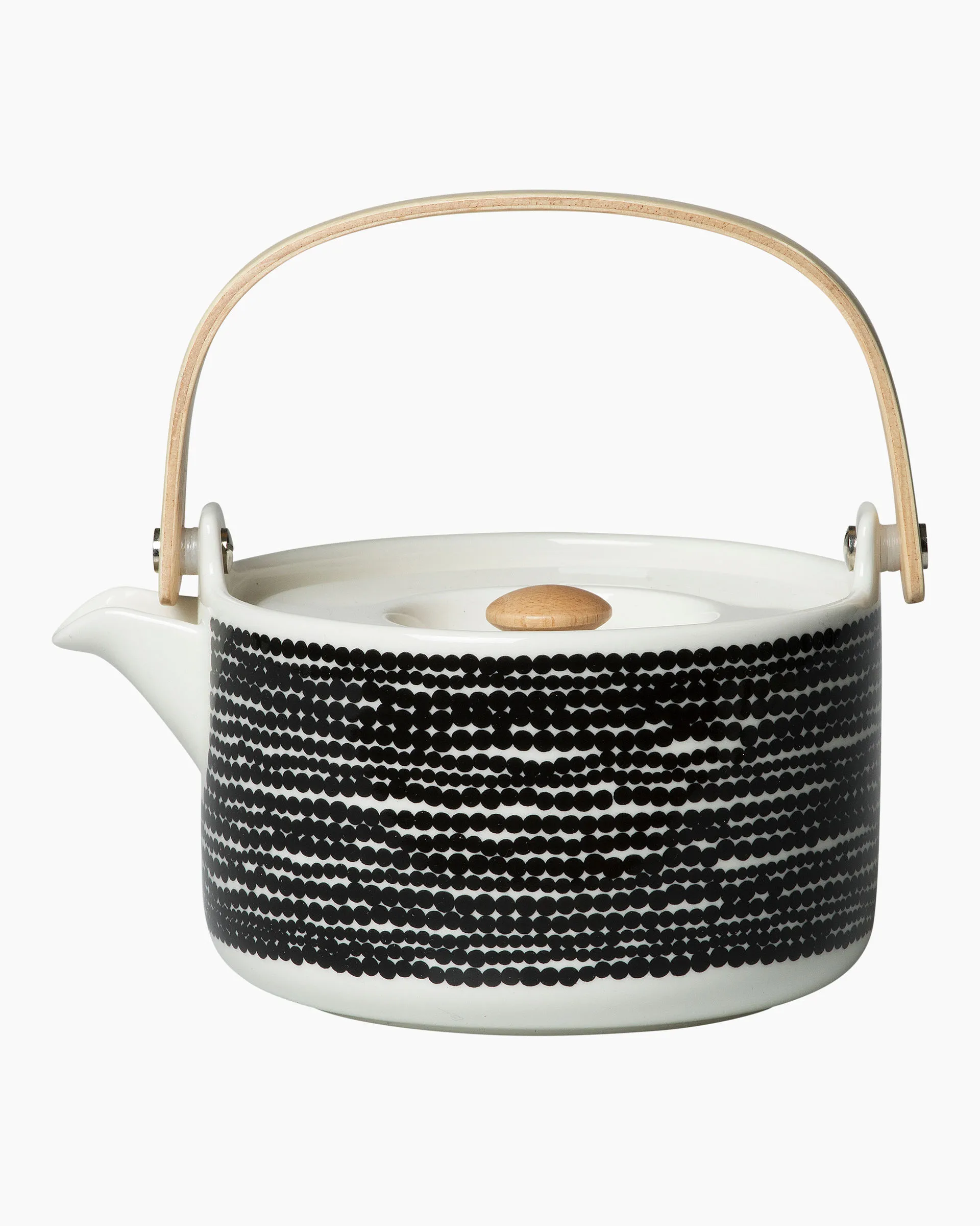 This wooden handle teapot features the graphic Siirtolapuutarha pattern designed by Maija Louekari. The pot, strainer and lid are made of white stoneware. Hand wash.
