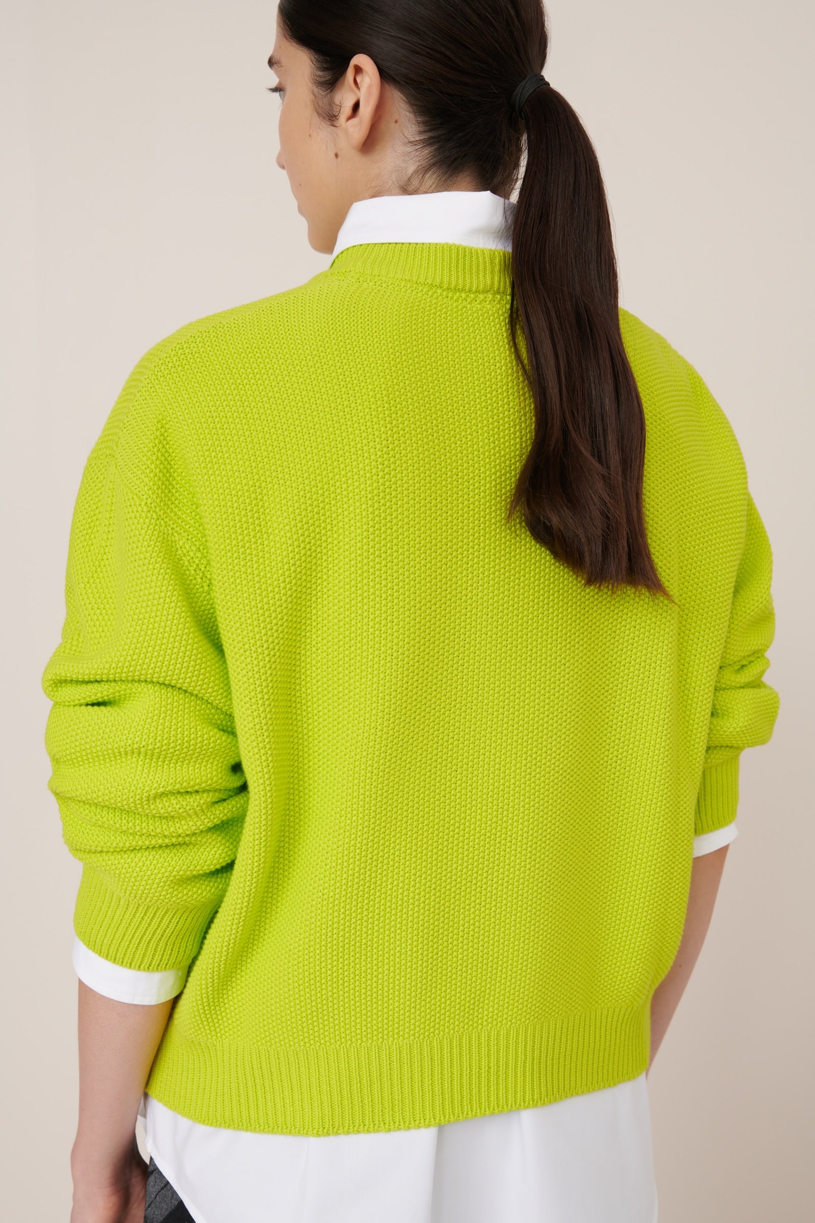 A relaxed take on our Escape Crew, the Hero crew is an easy-wear style in a bold Fluro Yellow colourway. Designed for an oversized fit, it features a crew neckline and is knitted in a soft organic cotton seed stitch. Finished with a narrow rib at the neckline, hem and cuffs for a refined touch.