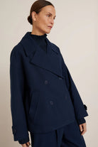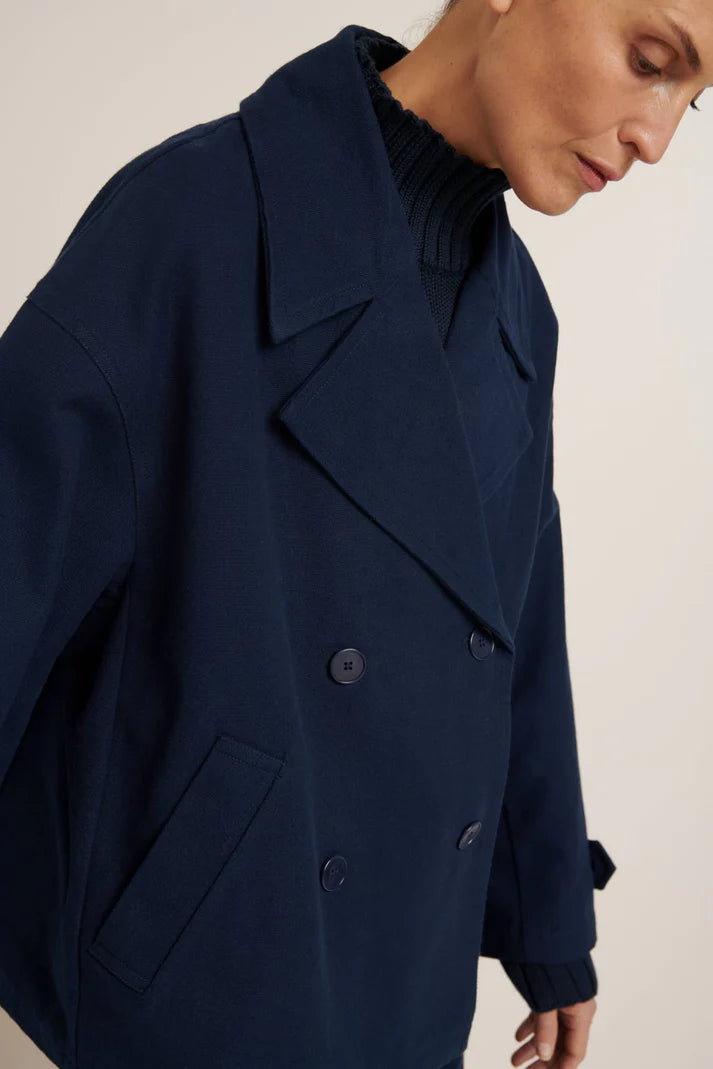 The Silhouette Jacket has a very oversized, boxy fit and is made in a heavyweight organic cotton canvas. Inspired by a traditional pea coat, it is double breasted with a lapel collar and fastens through the front with Tagua nut buttons. It has angled front pockets and finishes at hip length.
