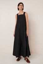 The Study Dress is a slip on style with a high square neckline at the front and back, and wide shoulder straps. With a standard fit through the bust, it falls to a full length pleated skirt with side seam pockets. Made in organic cotton poplin.