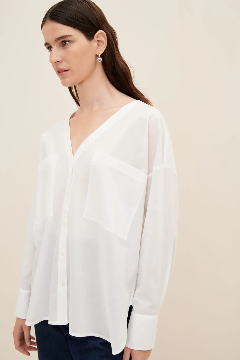 An interpretation of the classic white shirt, made from organic cotton voile. The Isabel Shirt has a relaxed fit with dropped shoulders and an open V neckline. A single pleat at the cuff of the sleeve creates subtle volume, while the deep dual button cuff is a nod to classic detailing. Two patch pockets accents the front, which fastens with shell buttons.