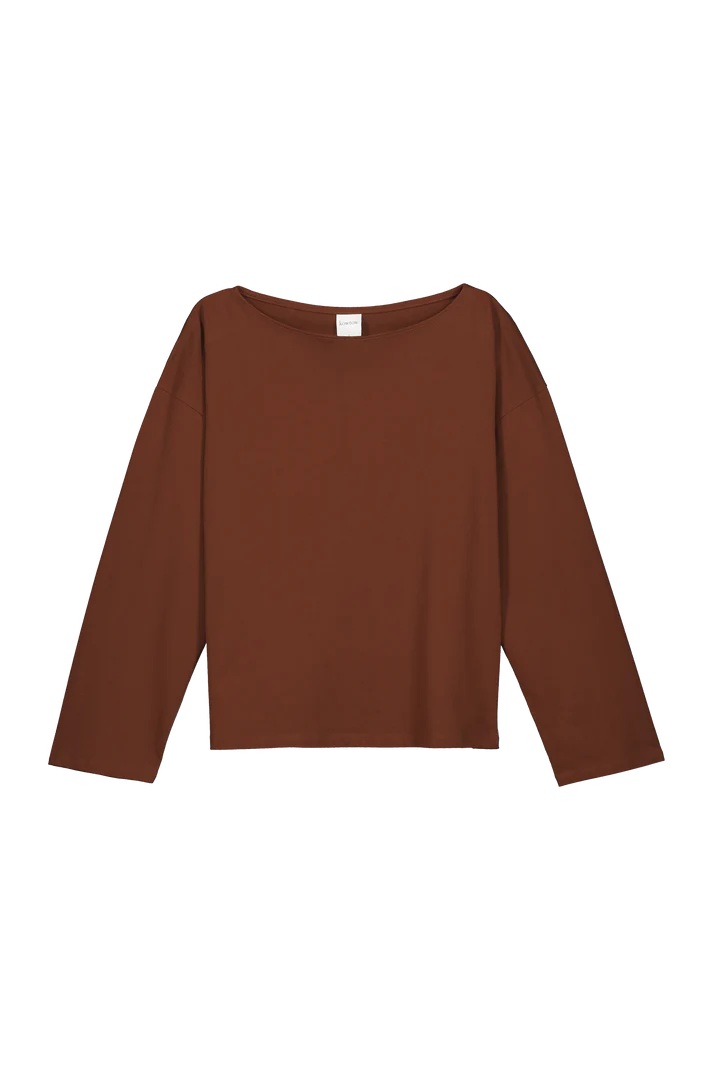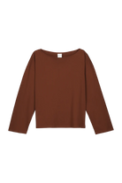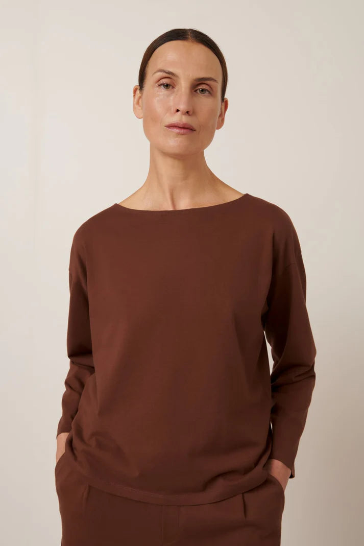 An elegant top with a wide boat neckline, dropped shoulder and wide straight sleeves. It has a straight, boxy shape through the body with a relaxed fit and is made in organic cotton in a midweight jersey.