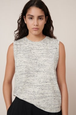 A relaxed, boxy style, the Singlet Top features a high crew neckline and a straight fit through the body. An effortless essential made from our new heavier-weight 250gsm organic cotton jersey, showcasing a graphic black and white marle. All Fairtrade organic cotton. All plastic-free.
