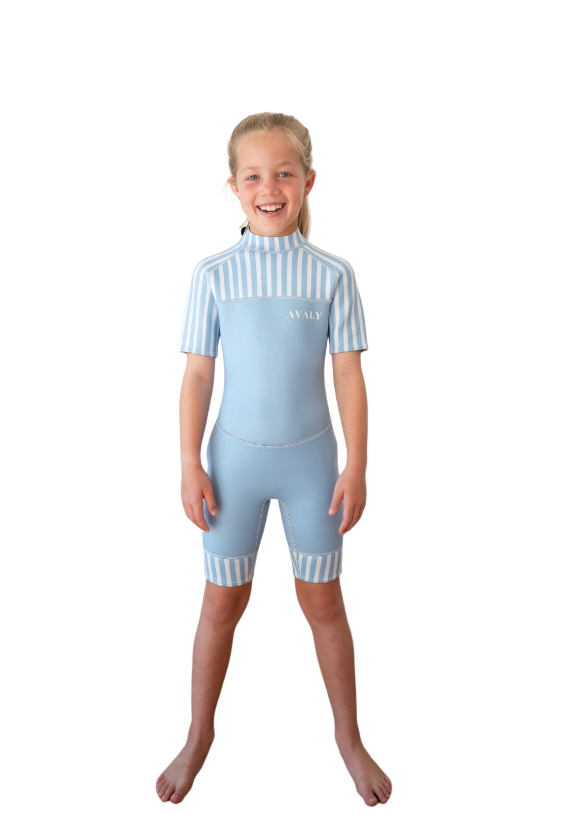 Introducing the Cottesloe, our versatile children's wetsuit featuring a bold light blue striped pattern on the top and around the legs, and a complementary light blue colour on the bottom. This stylish design is perfect for boys and girls, crafted with a commitment to protect our planet while keeping your little ones looking irresistibly cute.